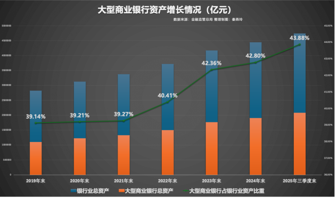今年以来,普惠小微贷款仍保持了较快增速。金融监管总局数据显示,截至今年三季度末,银行业金融机构普惠型小微企业贷款余额为36.5万亿元,同比增长12.1%。普惠型涉农贷款余额14.1万亿元,较年初增加1.2万亿元。作为对比,根据人民银行发布的2025年三季度金融机构贷款投向统计报告,同期金融机构人民币各项贷款余额为270.39万亿元,同比增速为6.6%。整体上来看,大型商业银行作为服务实体经济主力军的地位更加凸显,其资产扩张速度明显快于银行业金融机构整体的资产扩张速度,由此也带来了大型商业银行的资产占比不断提升。