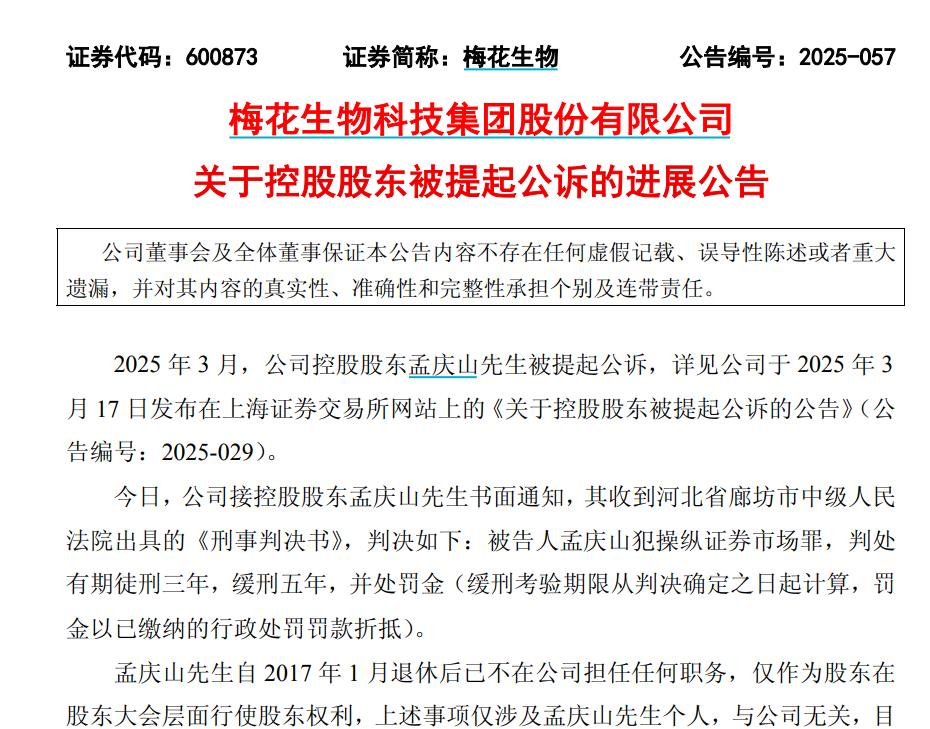 梅花生物发布公告称,2025年3月,公司控股股东孟庆山被提起公诉。11月7日,公司接到控股股东孟庆山书面通知,其收到河北省廊坊市中级人民法院出具的《刑事判决书》,判决如下:被告人孟庆山犯操纵证券市场罪,判处有期徒刑三年,缓刑五年,并处罚金(缓刑考验期限从判决确定之日起计算,罚金以已缴纳的行政处罚罚款折抵)。