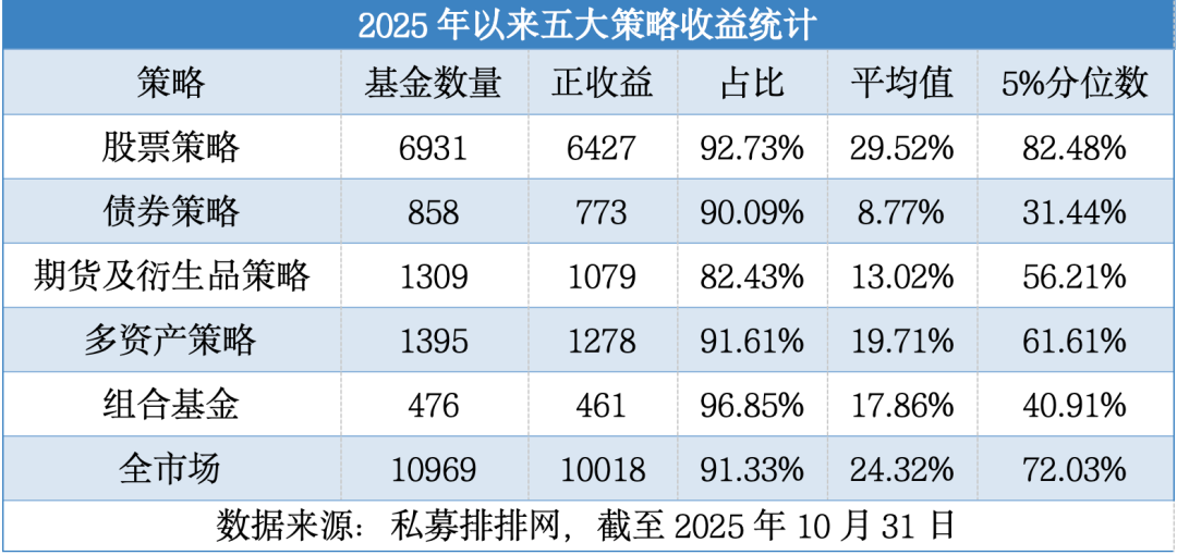 私募排排网数据显示,截至10月31日,全市场10969只私募证券投资基金年内平均收益率达24.32%,正收益占比高达91.33%,前5%分位数的私募产品收益率更是达72.03%。从策略类型来看,股票策略业绩表现今年“一骑绝尘”。据私募排排网统计,股票策略私募证券投资基金年内平均收益率为29.52%,正收益产品占比达92.73%,前5%分位数收益达82.48%,显著高于其他策略。