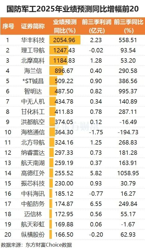 展望2025年全年,从机构预测角度来看,华丰科技2025年预测净利润同比增长为2054.96%,排在国防军工板块首位。军工板块业绩的强劲增长,无疑为投资者提供了新的投资机遇。理工导航紧随其后,2025年预测净利润同比增长1247.43%。北摩高科排在第三,2025年业绩预测同比为1184.83%。