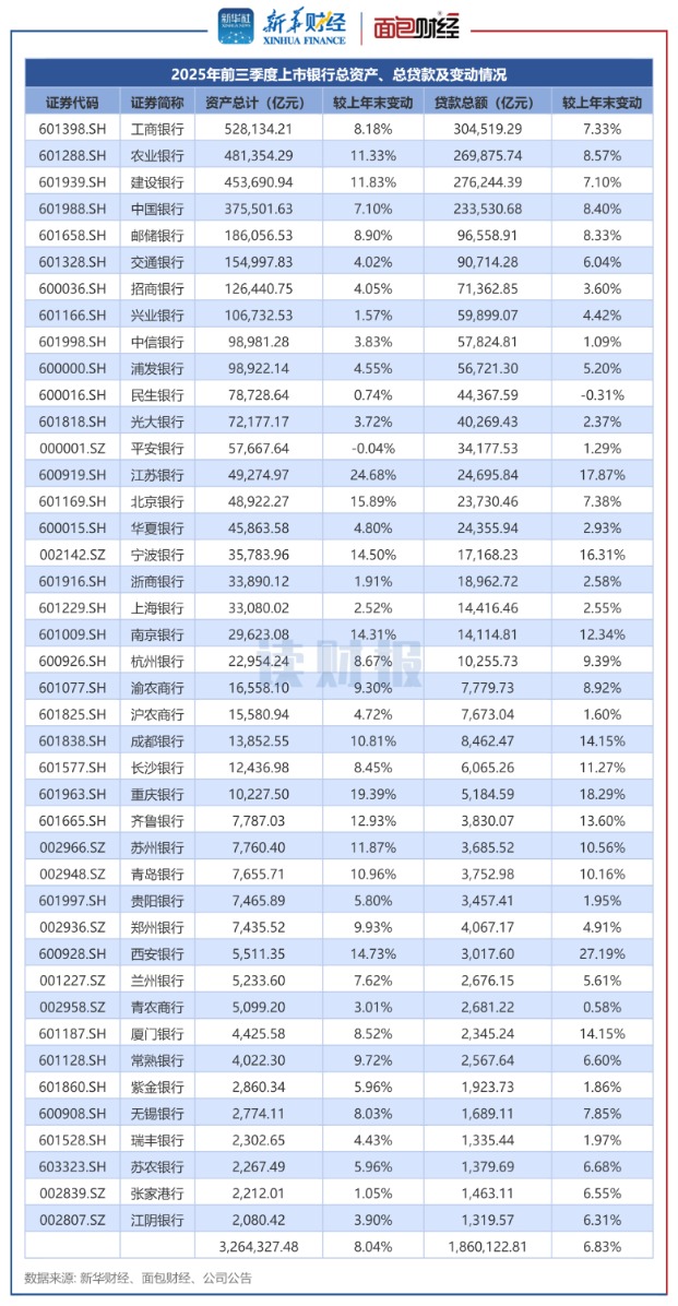 图2:2025年前三季度上市银行总资产、总贷款及变动情况