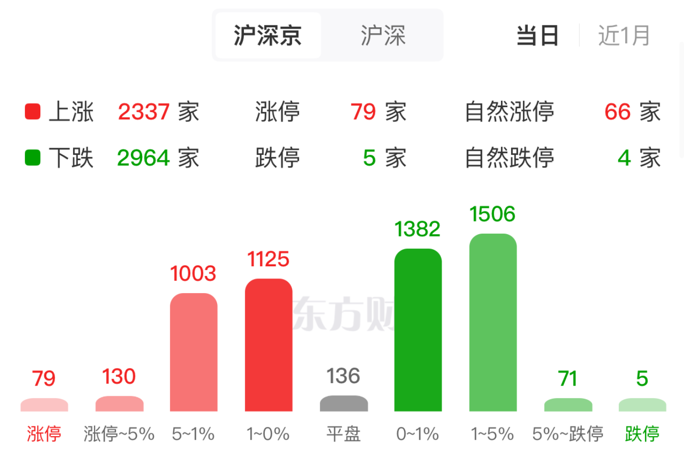 A股三大股指早盘集体低开,随后窄幅震荡,市场呈现分化态势。截至午间收盘,沪指跌0.43%,深成指跌0.35%,创业板指跌0.80%,军工板块表现抢眼。两市半日成交1.27万亿元,较昨日329亿元有所变化;全市场近3000股下跌,79股涨停,封板率超73%,市场情绪较为谨慎。