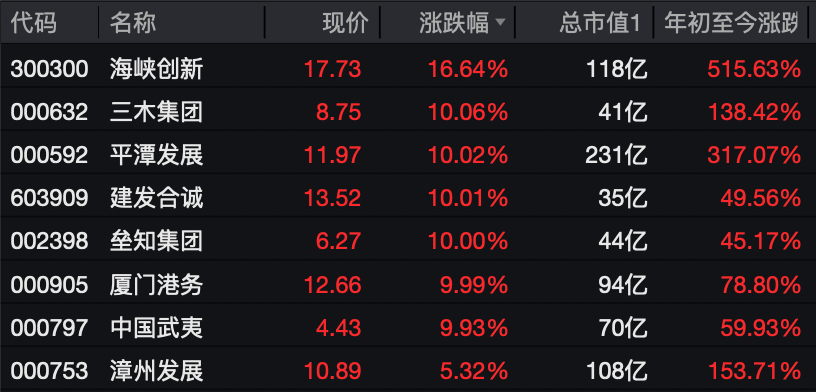 福建自贸区板块走强,两岸融合概念股持续拉升。相关个股掀涨停潮。平潭发展走出22天14板、三木集团录得7连板,建发合诚、垒知集团、厦门港务、中国武夷等纷纷涨停,海峡创新大涨超16%。