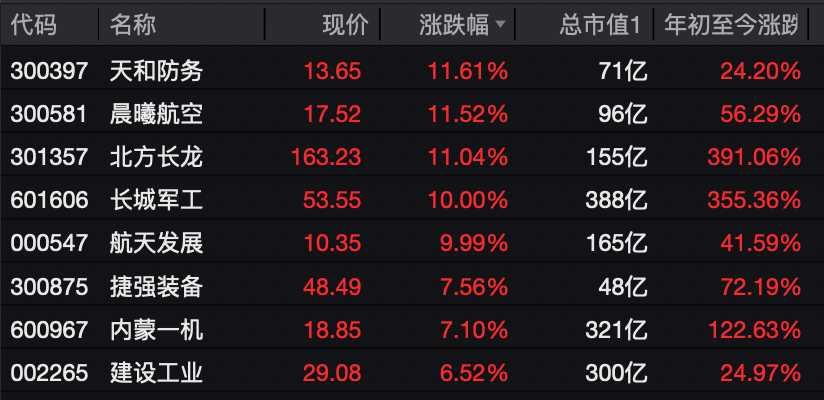 今日上午,航天军工板块涨幅居前。个股方面,长城军工、航天发展录得10cm涨停,天和防务、晨曦航空、北方长龙涨超11%,中航成飞、中航沈飞涨超2%。孚日股份连收8个涨停板,截至午盘报12.72元/股,最新市值为120亿元。