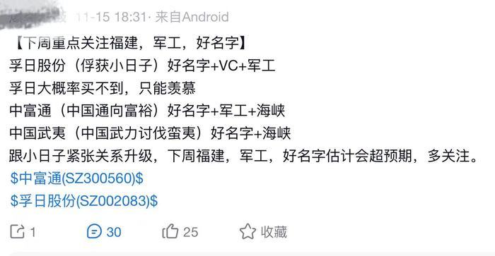 网传截图的出现,与近期市场对孚日股份的“玄学炒作”相呼应。在投资者社区,记者注意到,11月16日上午,一名投资者将孚日股份的上涨归因于“好名字”:“孚日股份(俘获小日子)好名字+VC+军工”。