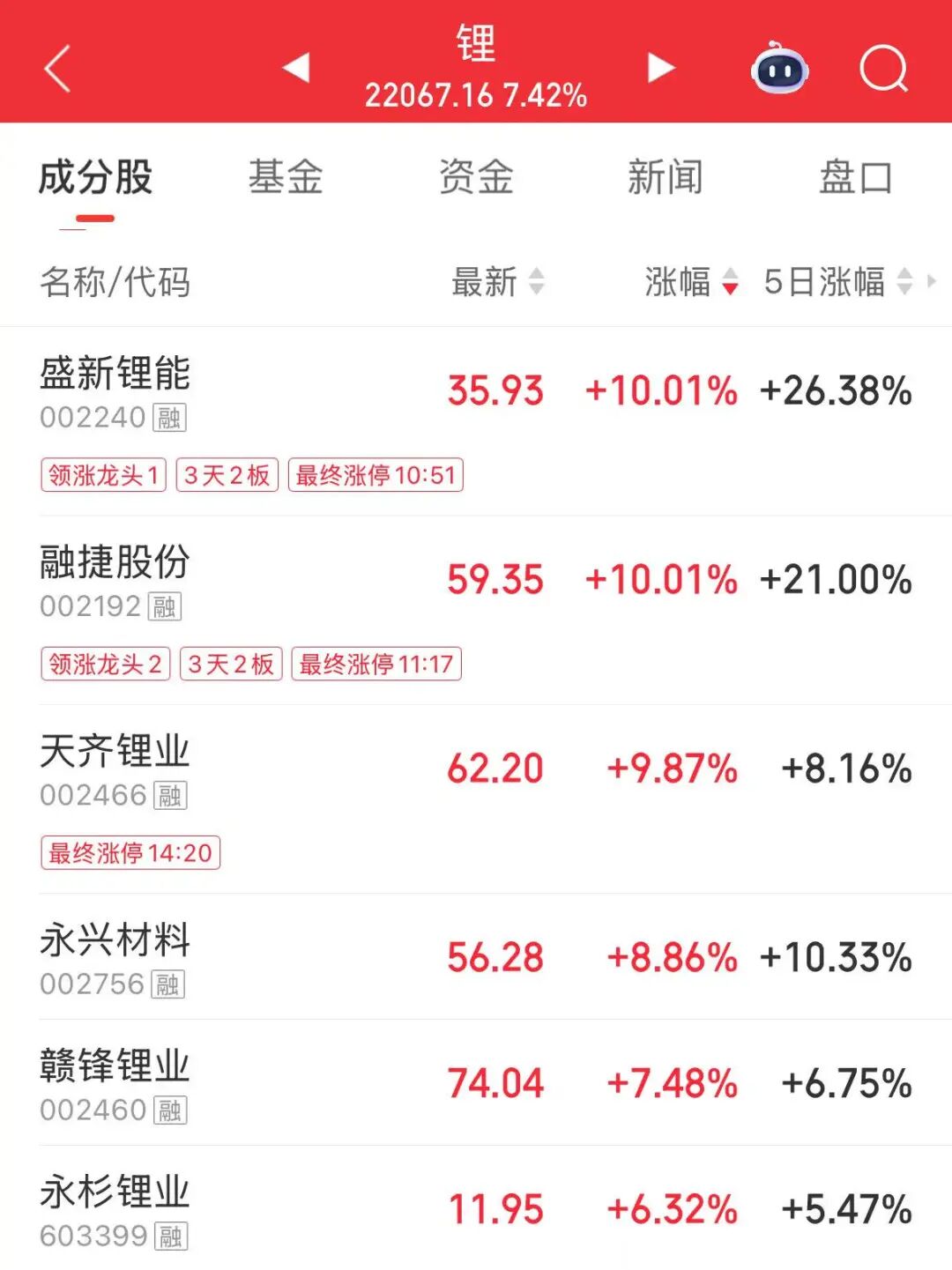 锂电板块狂飙,盛新锂能、融捷股份强势涨停,天齐锂业涨超9%,永兴材料涨超8%、赣锋锂业涨超7%,整个锂电板块呈现普涨格局。消息面上,11月17日,碳酸锂期货全线涨超7%,主力合约盘中突破9.4万关口,最高触及94760元/吨,刷新一年余新高,碳酸锂期货市场表现抢眼。
