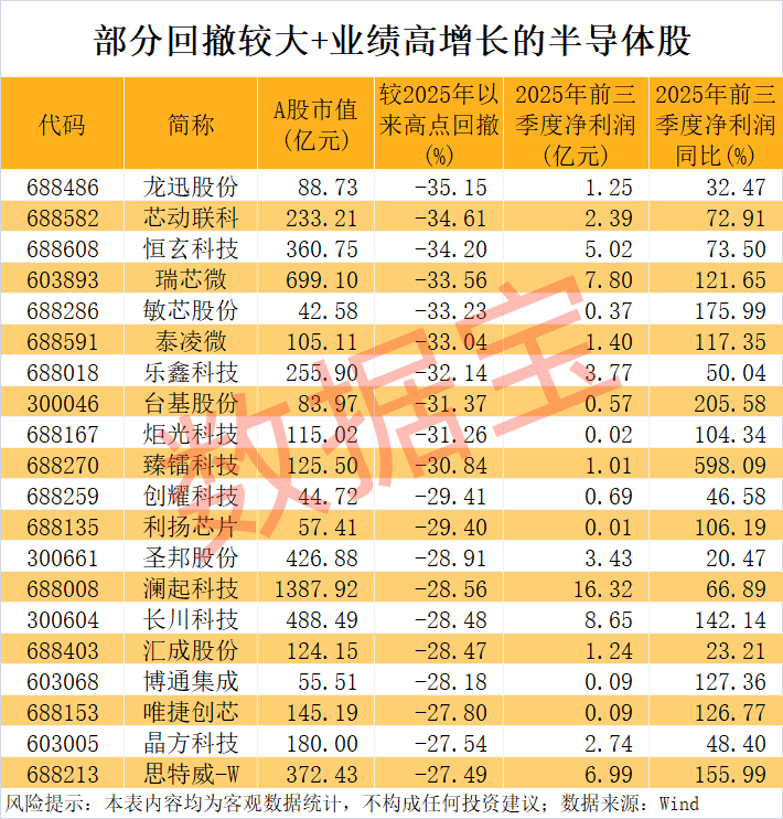 从当前的股价表现来看,不少业绩高增长的半导体股票已出现大幅回撤。数据宝统计,今年前三季度净利润同比增长20%以上(含扭亏为盈)的股票中,截至11月17日收盘,最新收盘价与年内高点相比回撤幅度超20%的有50只。回撤幅度最大的前5只股票分别为龙迅股份、芯动联科、恒玄科技、瑞芯微、敏芯股份,这些股票的回撤情况值得投资者密切关注。