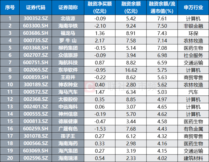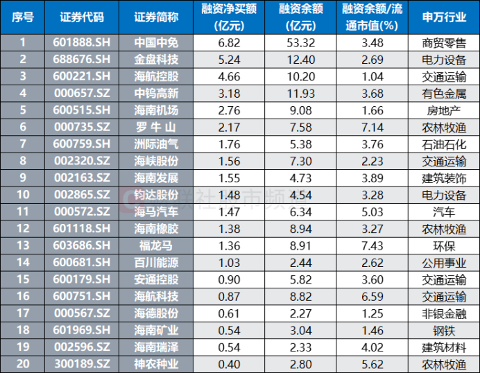 可关注标的方面,筛选海南自贸概念股,截至11月14日数据,中国中免、金盘科技、海航控股、中钨高新、海南机场、罗牛山近1个月融资客加仓规模居前,融资净买额分别达6.82亿元、5.24亿元、4.66亿元、3.18亿元、2.76亿元、2.17亿元。若以融资客控盘比统计,北信源、海南华铁、福龙马、罗牛山、柳药集团目前融资余额较流通市值比例超7%。