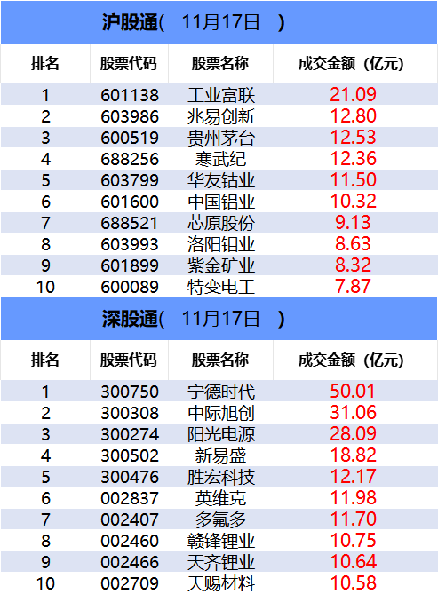 从沪股通前十大成交个股来看,工业富联位居首位;兆易创新和贵州茅台分居二、三位。