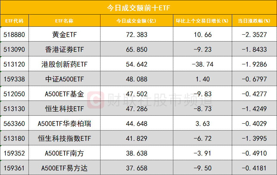 从成交额前十的ETF来看,黄金ETF(518880)成交额位居首位,香港证券ETF(513090)成交额位居次席。