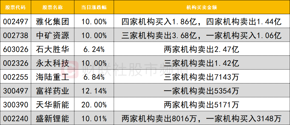 今日龙虎榜机构活跃度较高,买入方面,锂矿概念股雅化集团获四家机构买入1.86亿,四家机构卖出1.44亿。