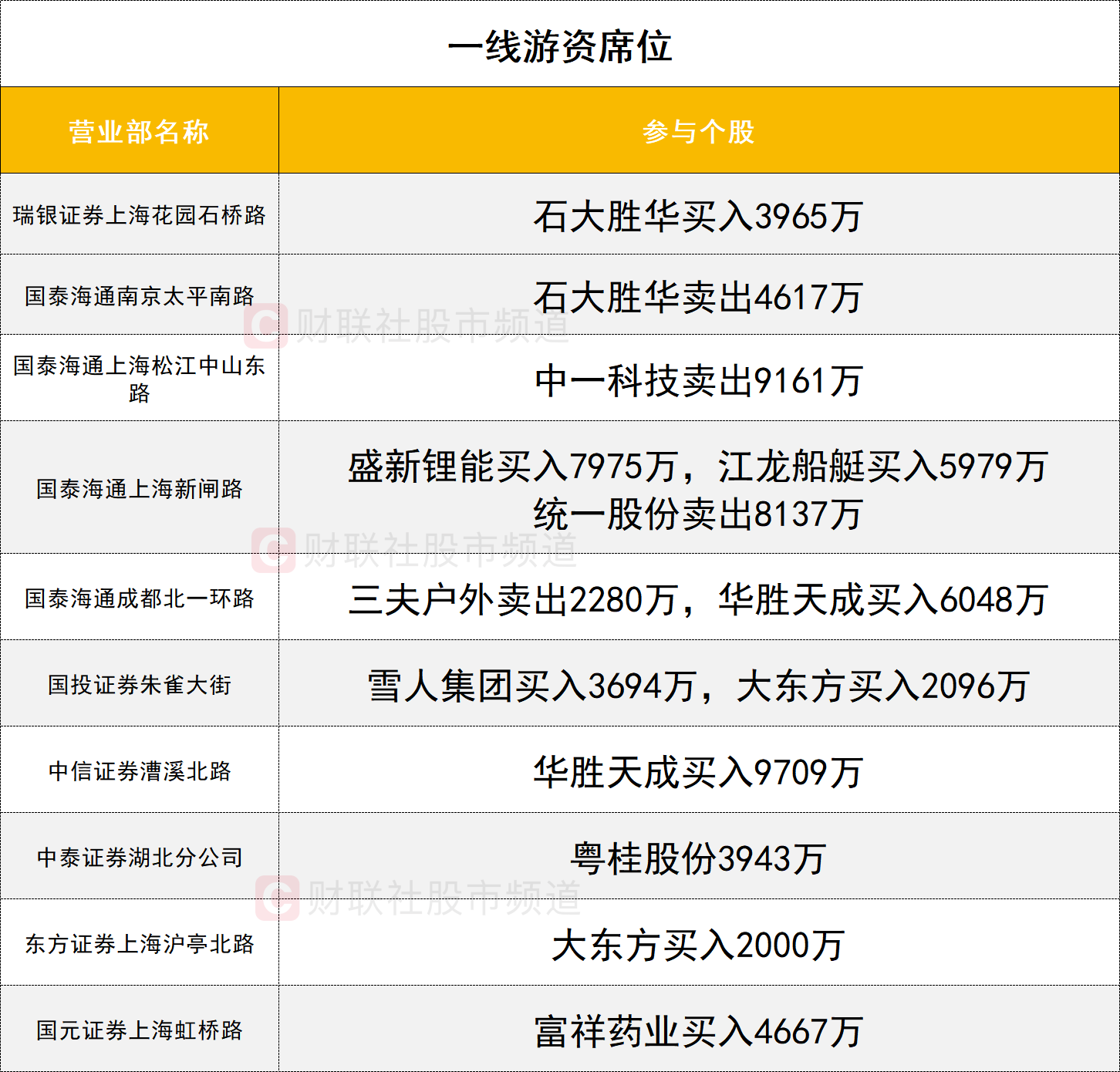 一线游资活跃度有所降低,盛新锂能获一家实力游资席位(国泰海通证券上海新闸路)买入7975万。石大胜华遭一线游资席位(国泰海通证券南京太平南路)卖出4617万。