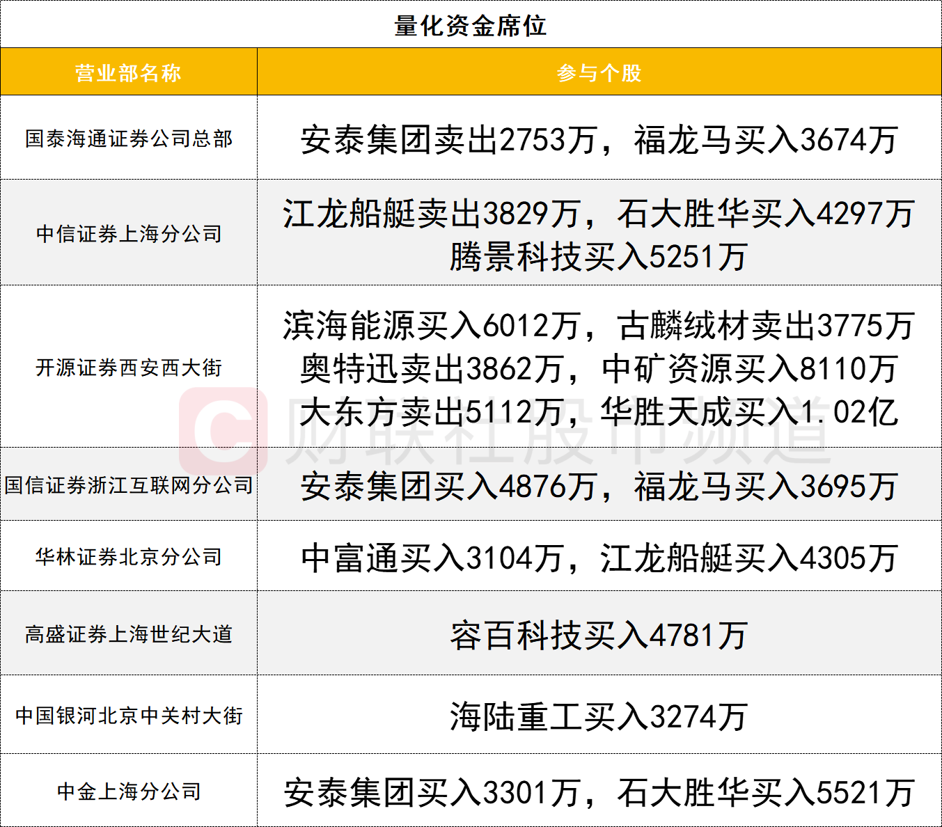 量化资金活跃度有所降低,中矿资源获开源证券西安西大街席位买入8110万。华胜天成获开源证券西安西大街席位买入1.02亿。