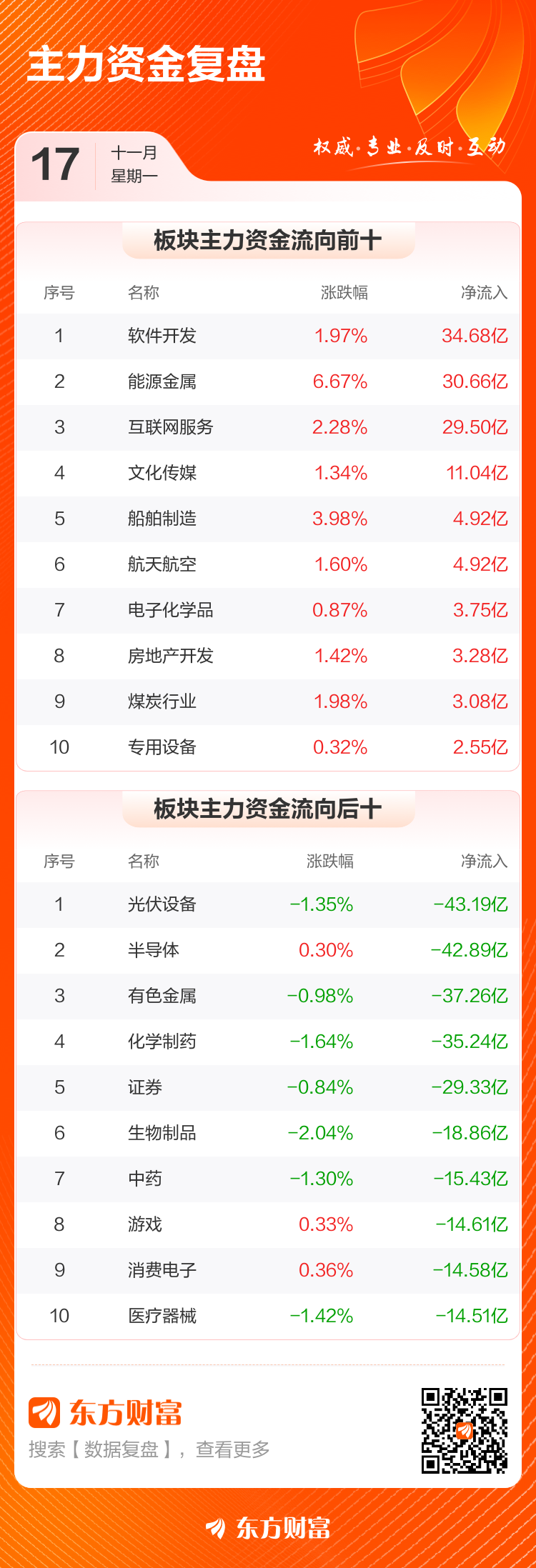 11月17日,A股市场表现分化,沪指跌0.46%,深成指跌0.11%,创业板指跌0.2%,市场整体呈现震荡态势。两市成交额1.91万亿,较上个交易日缩量473亿,显示出市场观望情绪浓厚。数据显示,今日大盘主力资金净流出396.40亿,资金流向成为市场关注焦点。软件开发、能源金属、互联网服务等板块主力资金流入排名居前,其中软件开发净流入34.68亿元,显示出资金对科技板块的青睐。