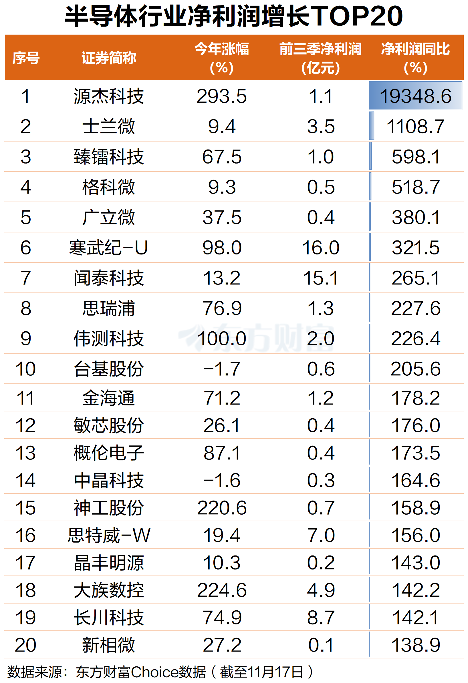 业绩方面,这167股前三季度净利润同比增幅中位数为18.42%,较去年同期增加了11个百分点;其中,有108股今年前三季度净利润同比增长,占比65%,较去年同期上升了18家。有32股前三季度净利润同比翻倍,源杰科技同比增超19倍,士兰微同比增超11倍,臻镭科技、格科微等均同比增超5倍,半导体行业业绩表现亮眼。