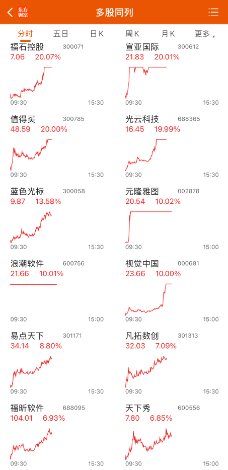 AI应用方向早盘延续强势,其中AIGC概念股集体大涨,成为市场焦点。宣亚国际收获20cm两连板,福石控股、值得买、光云科技均20cm涨停,视觉中国、元隆雅图、浪潮软件亦封板,蓝色光标涨超13%,易点天下、福昕软件、天下秀等多股跟涨,展现出强劲的上涨势头。消息面上,蚂蚁集团今日发布全模态通用AI助手“灵光”,在移动端实现“自然语言30秒生成小应用”,首批上线三大功能“灵光对话”“灵光闪应用”“灵光开眼”,支持3D、音视频、图表、动画、地图等全模态信息输出,为AI应用市场注入新活力。