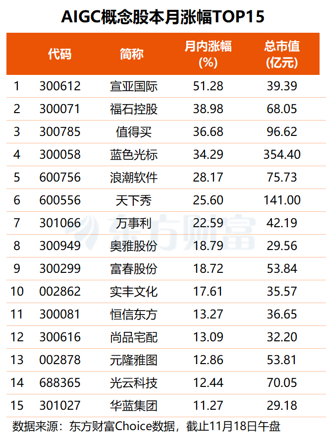 本月以来,多只概念股股价显著上涨,宣亚国际、福石控股、值得买位居前三,月内涨幅分别为51.28%、38.98%和36.68%,成为市场追捧的热点。值得买今年前三季度实现归母净利润1344.86万元,同比增长253.49%,业绩表现亮眼。开源证券在研报中指出,前三季公司确认AI相关收入1.32亿元,正式开启AI商业化,看好公司AI商业化持续推进,AI全面赋能公司业务成长,Q4“双11+国补”也有望助力公司业绩继续修复,为投资者带来信心。