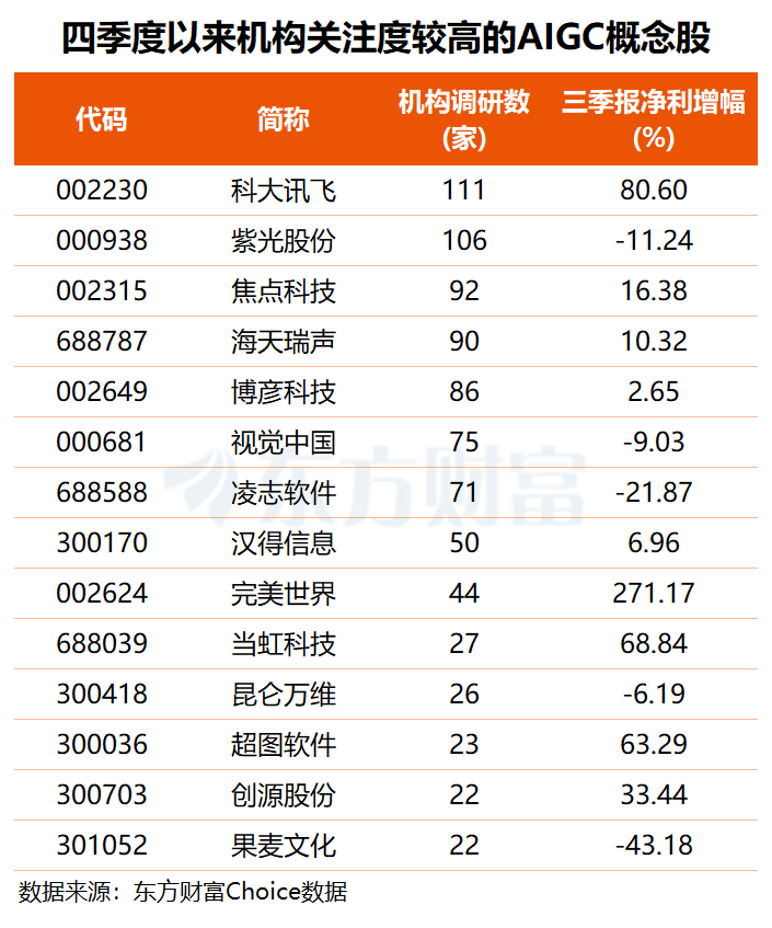 机构调研方面,进入四季度以来,共有23只AIGC概念股获得机构调研,其中科大讯飞、紫光股份的机构关注度最高,10月以来均获逾百家机构集中调研,显示出机构对AI领域的浓厚兴趣。焦点科技、海天瑞声、博彦科技、视觉中国、凌志软件等个股的机构调研数也都超50家,进一步印证了AI领域的热度。今年前三季度,科大讯飞实现营业收入169.89亿元,同比增长14.41%,其中Q3实现营收60.78亿元,同比增长10.02%,业绩稳步增长。