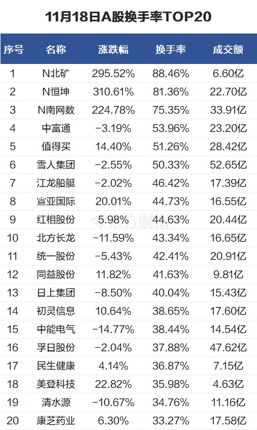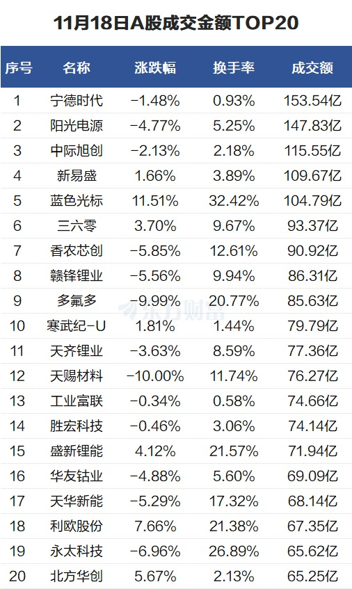 11月18日A股三大指数集体收跌,个股成交与换手率情况受关注
