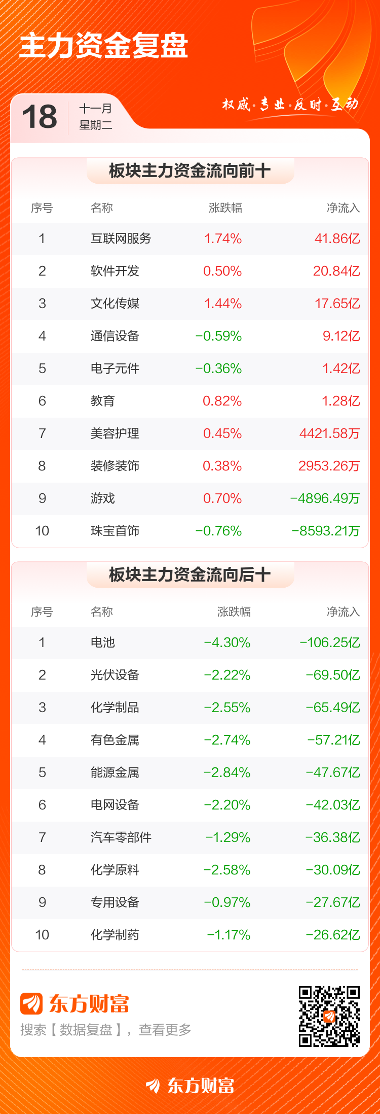 11月18日,A股市场表现不佳,沪指跌0.81%,深成指跌0.92%,创业板指跌1.16%,股市行情呈现整体下行态势。两市成交额1.93万亿,较上个交易日放量153亿。数据显示,今日大盘主力资金净流出993.93亿,资金流向成为市场关注焦点。互联网服务、软件开发、文化传媒等板块主力资金流入排名居前,其中互联网服务净流入41.86亿元,显示出资金对这些板块的青睐。