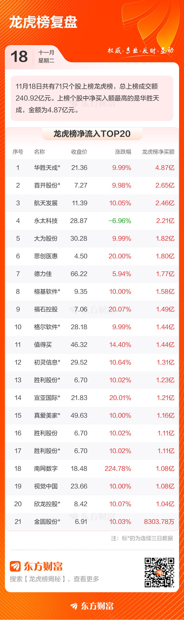 11月18日,A股市场共有71只个股强势上榜龙虎榜,总上榜成交额高达240.92亿元,这一数据直观反映了当日股市的活跃程度与资金流向。在众多上榜个股中,华胜天成脱颖而出,成为净买入额最高的个股,金额高达4.87亿元,显示出市场资金对其的高度关注与看好。