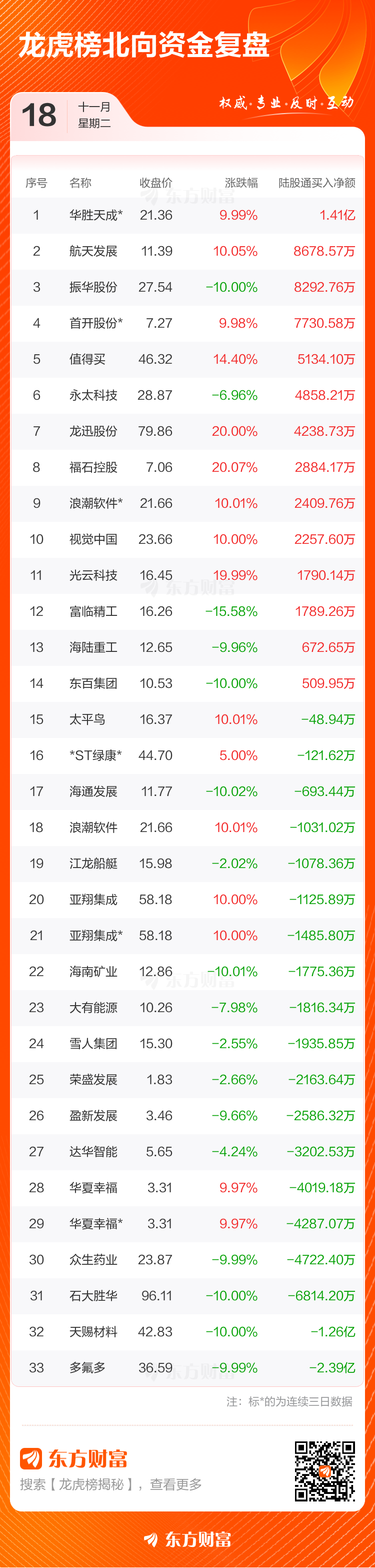 11月18日龙虎榜揭晓:华胜天成净买入额居首