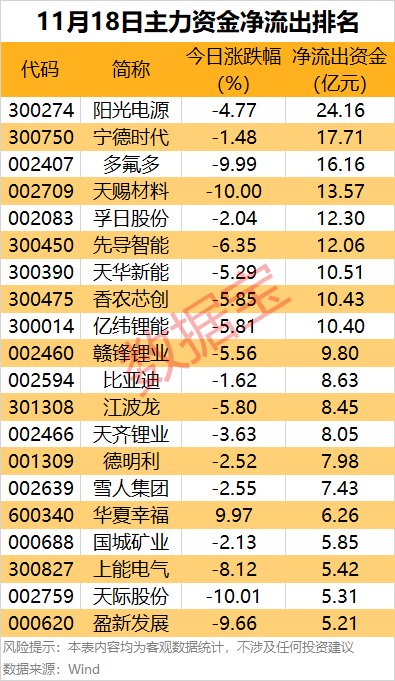 据数据宝统计,近200股主力资金净流出均超1亿元,其中20股净流出金额均超5亿元。9股遭到主力资金大幅净流出均超10亿元,其中阳光电源主力资金净流出24.16亿元,居首;多只热门股股价回调,宁德时代、多氟多和天赐材料主力资金净流出均超13亿元,其中多氟多和天赐材料股价均跌停。