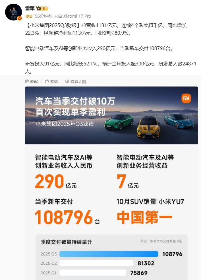 小米集团2025年Q3业绩亮眼,汽车盈利与内存涨价成焦点