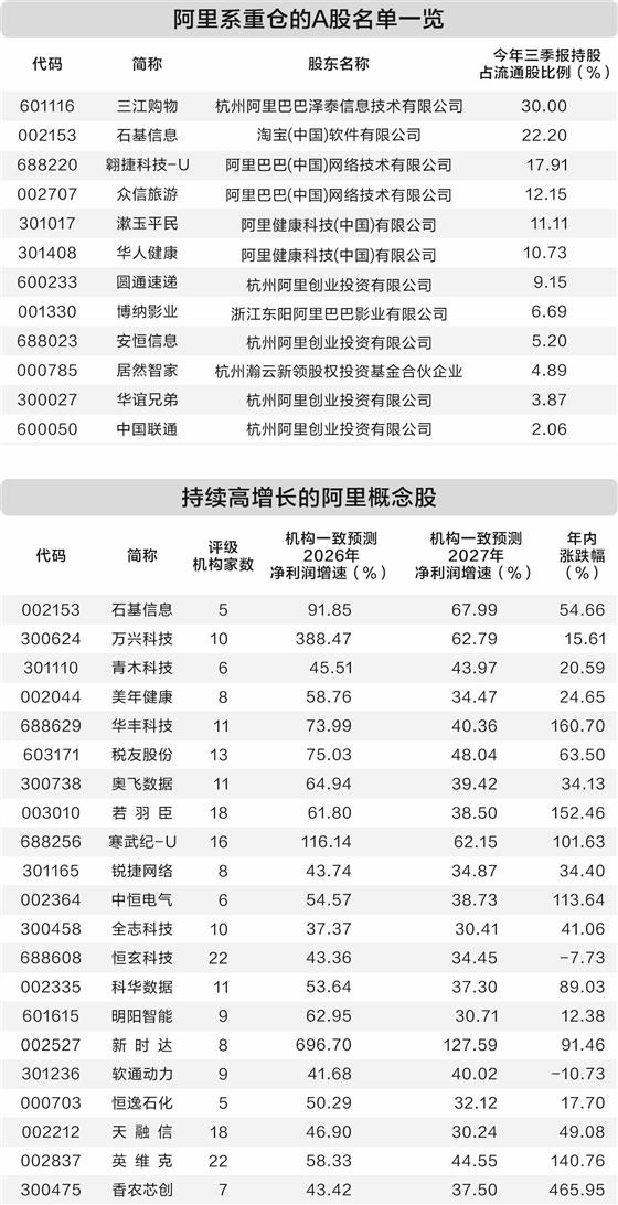 据证券时报·数据宝统计,阿里概念中,有21只个股有望持续高成长,机构一致预测2026年、2027年净利润增速均超30%且评级机构数在5家以上。其中,石基信息、万兴科技、新时达、寒武纪-U等个股机构一致预测明后两年净利润增速均有望超50%。AI应用市场的繁荣,也为这些个股带来了更多的投资机会。