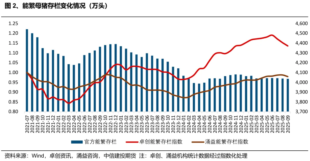自今年6月以来,政策层面持续加强生猪产能调控。9月16日,农业农村部畜牧兽医局会同发改委价格司召开生猪产能调控企业座谈会,牧原、温氏、新希望等25家头部猪企参会,明确要求企业带头控制产能,包括调减能繁母猪、降低出栏量等。经过数月调控,10月份全国能繁母猪存栏降至3990万头,环比-1.1%,行业去产能加速,首次回落至4000万头以下,标志着生猪产能正式步入政策预设的“绿色合理区间”(3900万头±8%)。