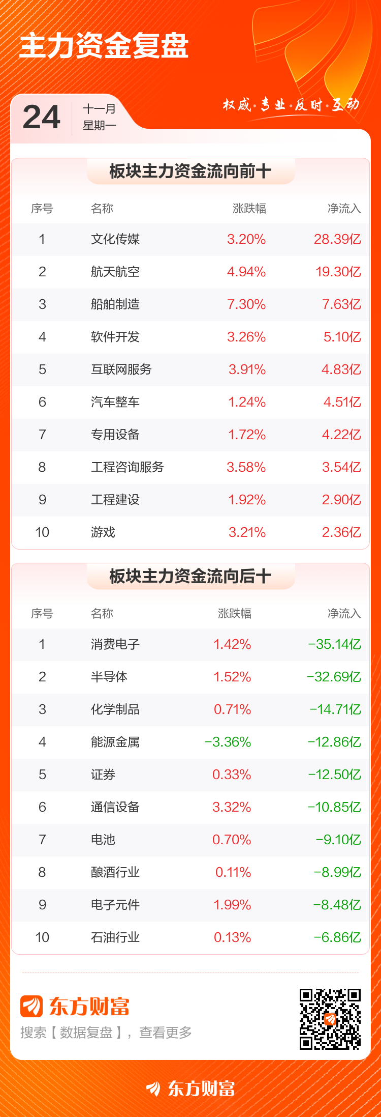 11月24日,A股市场呈现震荡整理态势,沪指涨0.05%,深成指涨0.37%,创业板指涨0.31%。两市成交额1.73万亿,较上个交易日缩量2379亿。数据显示,今日大盘主力资金净流出154.69亿,但文化传媒、航天航空、船舶制造等板块获主力资金青睐,其中文化传媒板块主力净流入28.39亿元,显示市场结构性机会仍存。