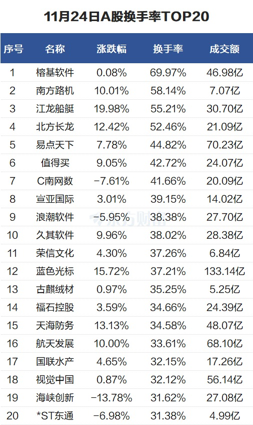 个股方面,中际旭创当日成交212.23亿元。工业富联当日成交187.24亿元。当天换手率最高的个股为榕基软件,全天换手率69.97%。南方路机紧随其后,全天换手率58.14%。