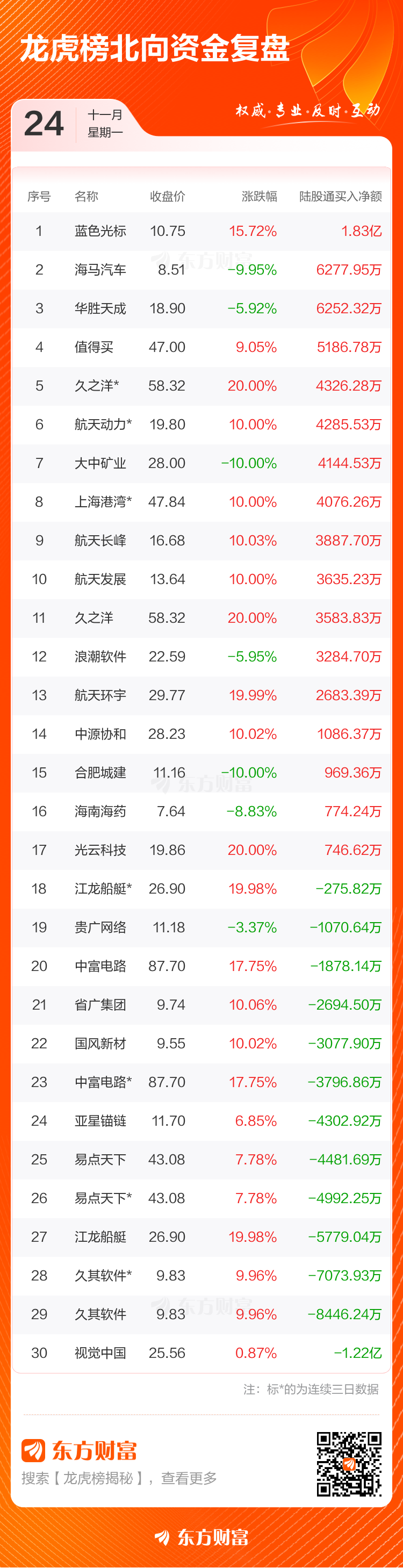 11月24日A股龙虎榜:蓝色光标净买入8.98亿领跑 浪潮软件获游资大举买入