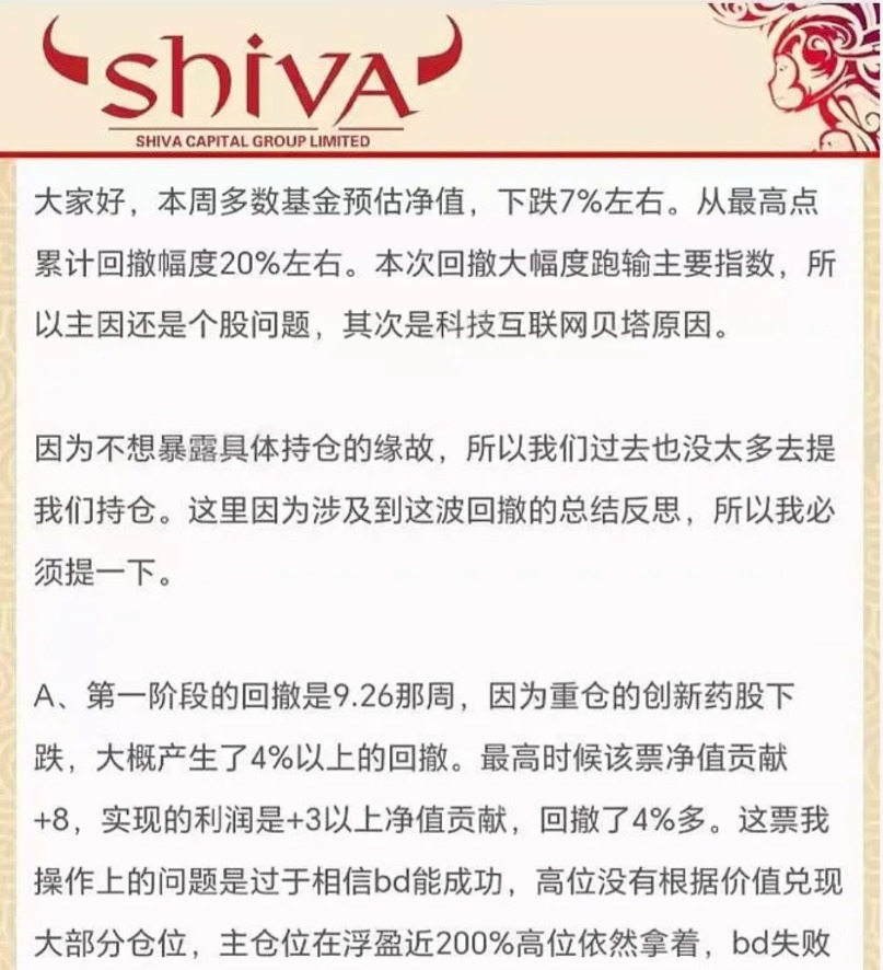 希瓦私募最新发布的周报显示,旗下多数基金单周下跌7%左右,从最高点累计回撤幅度约20%,本次回撤大幅跑输主要指数。