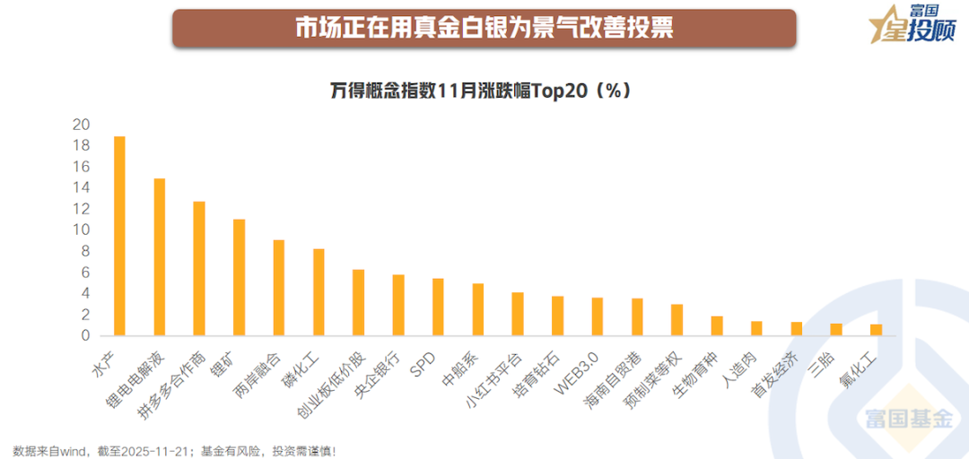 三季报收官的帷幕落下,A股正式进入业绩真空期。当前市场虽缺乏清晰的上涨主线,但另一方面,结构性机会却在不断涌现。围绕次年政策与景气趋势的预期交易持续升温,11月以来的市场表现已给出明确信号,涨幅靠前的前20大概念板块中,锂电池、化工等景气相关主题占据半壁江山,印证了景气策略正成为资金追捧的核心逻辑。