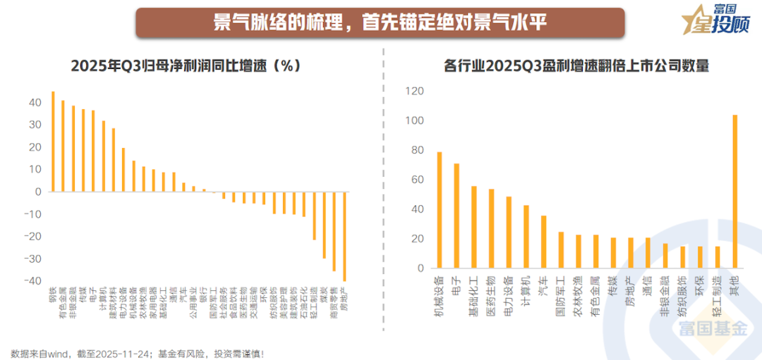 从行业盈利维度观察,非银、有色、传媒、电子、计算机无疑是高景气的代表,三季报数据显示,归母净利润同比增速均超30%,在申万一级行业中名列前茅。更值得关注的是高盈利个股占比,688家盈利同比翻倍的上市公司中,机械设备、电子、基础化工、医药生物、电力设备、计算机领域贡献了超五成席位,这些行业中实现高增长的企业比例明显高于其他领域。整体来看,由技术创新驱动的盈利高增,构成了景气投资的核心底座。