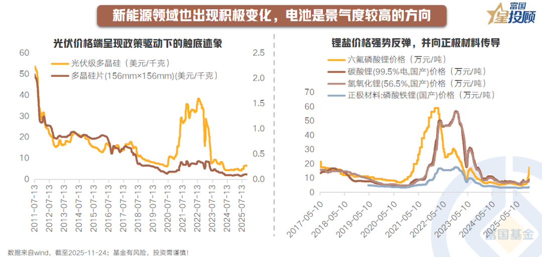 产能过剩的压力虽然仍在,但领先企业的盈利能力已经在改善。电力设备行业被公募主动权益基金加仓,成为困境反转的核心方向。其中,电池材料端受益于供需错配,是当前景气度较高的方向,并沿着锂盐到正极材料的路径向上传导。在企业减产与反内卷政策支撑下,光伏产业链价格目前处于底部震荡期,但反转尚未确立,三季度光伏企业业绩呈触底回稳迹象。短期看,上游硅料和组件环节有望率先受益;中长期看,行业反转将取决于库存去化进度与终端需求恢复程度。