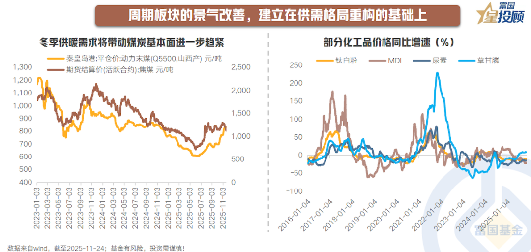 一方面,供给端的约束越来越明显。经过多年的资本开支下行,叠加环保要求提升、产业政策调整,进一步优化供给结构。另一方面,需求端,海外需求的稳健增长,国内稳增长政策的持续发力,也在为传统需求托底。本轮周期复苏或更具韧性,政策导向是重要线索,全球财政货币宽松与国内产业支持政策的叠加,直接利好化工、有色金属等顺周期板块。预期端,工业企业利润增速持续回升,为明年PPI增速回正提供支撑,进一步强化周期行业的盈利改善逻辑。