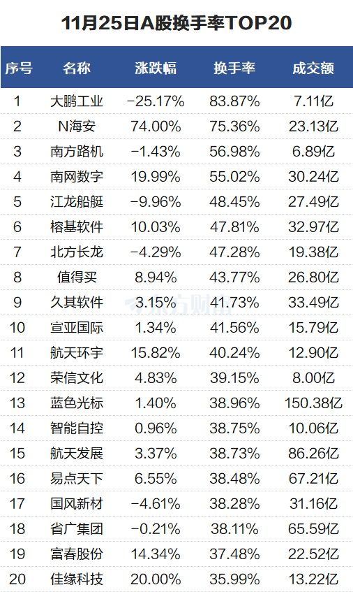 当天换手率最高的个股为大鹏工业,全天换手率83.87%。N海安紧随其后,全天换手率75.36%。