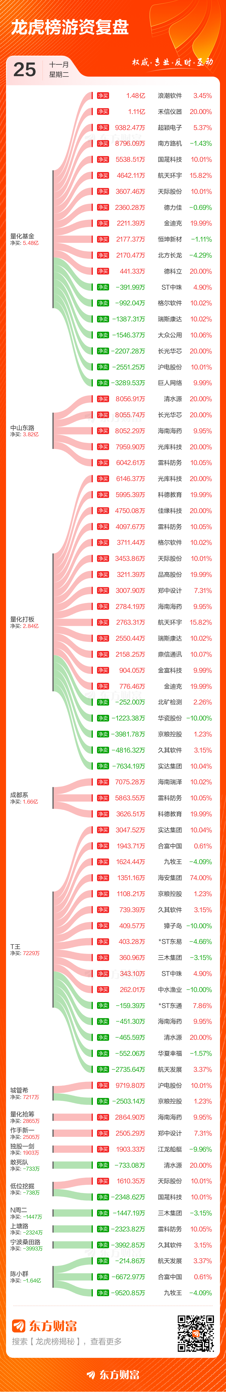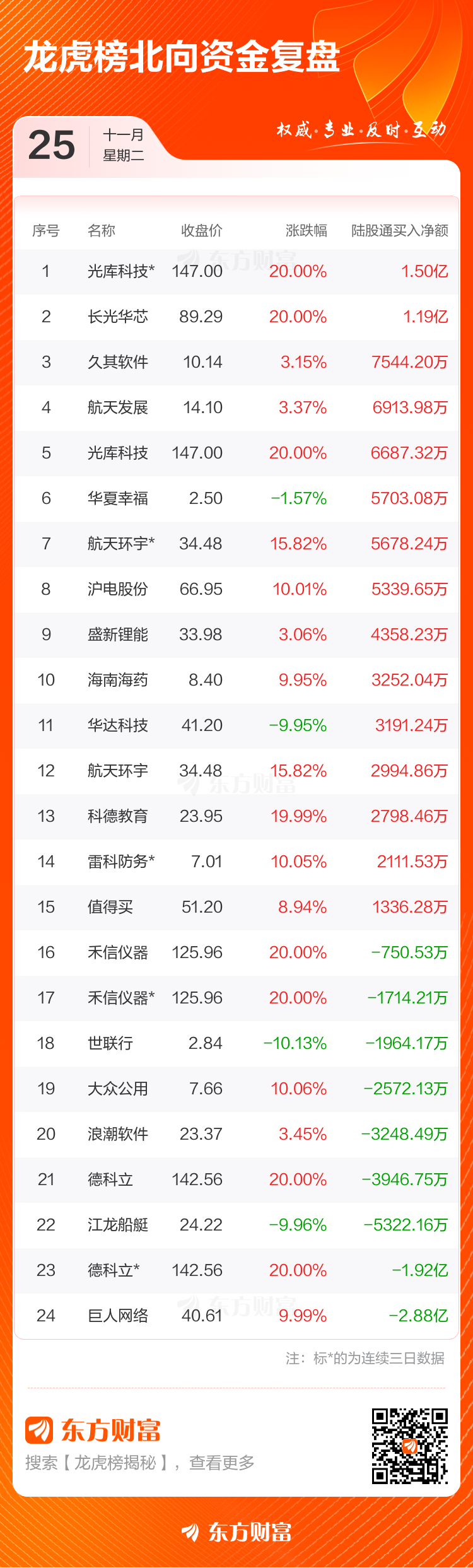11月25日共有60只个股上榜龙虎榜,总上榜成交额205.43亿元。上榜个股中净买入额最高的是光库科技,金额为5.42亿元。