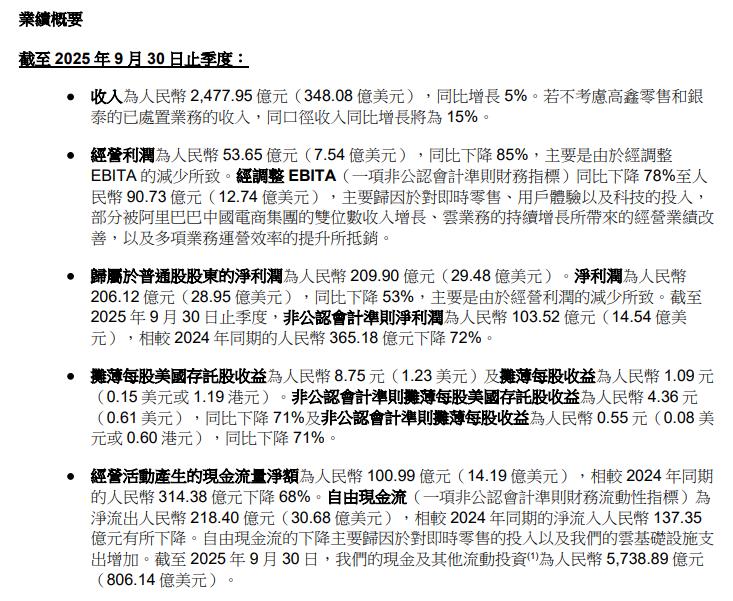 阿里巴巴集团发布2026财年第二季度财报,第二季度营收2477.95亿元,同比增长5%,预估2452亿元;第二季度调整后每ADS收益4.36元,预估6.34元;第二季度中国电商事业集团收入1325.8亿元;调整后净利润103.5亿元,预估168亿元。