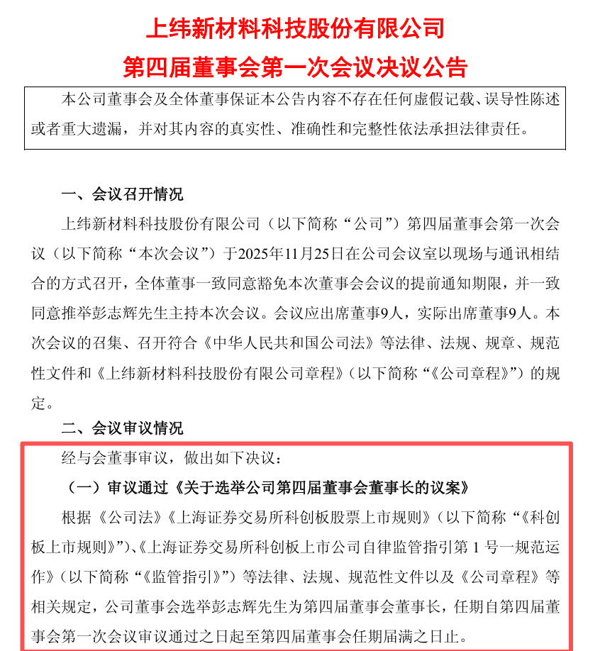 在随后举行的第四届董事会第一次会议上,彭志辉被一致推选为公司董事长,并担任战略与可持续发展委员会主任委员。这一重大人事变动背后,是公司控制权的变更。此前,上海智元恒岳科技合伙企业已成为上纬新材新任控股股东,邓泰华成为实际控制人。