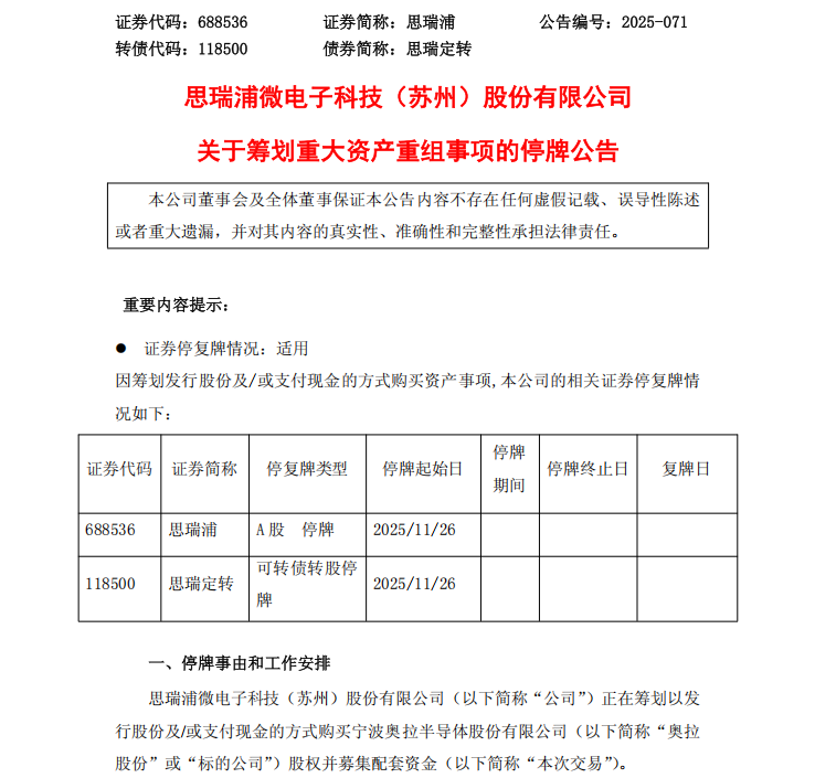 【导读】思瑞浦筹划购买奥拉股份股权,计划自11月26日开市起停牌
