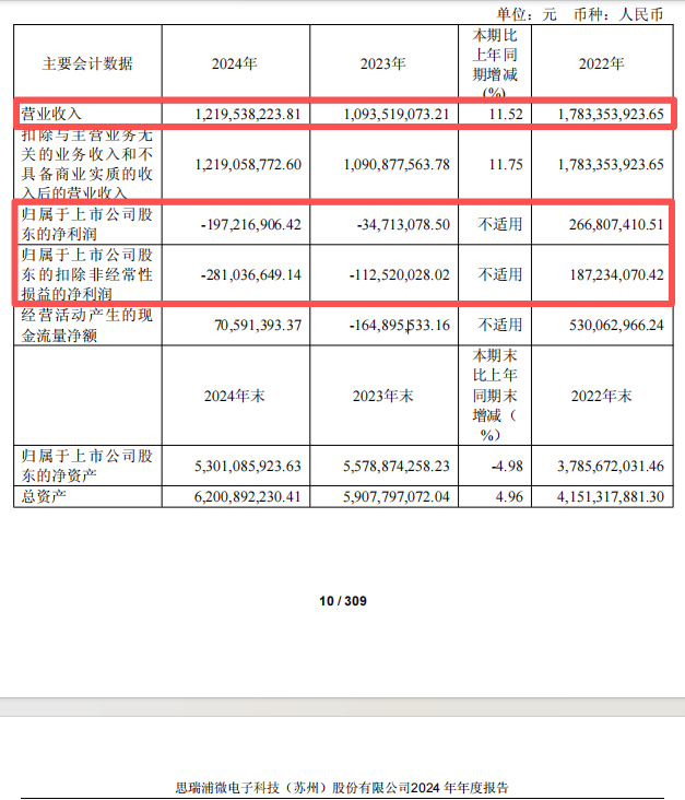 近年来,思瑞浦的业绩较为波动。2022年至2024年,思瑞浦的营业收入分别为17.83亿元、10.94亿元、12.20亿元,归母净利润分别为2.67亿元、-3471.31万元、-1.97亿元。