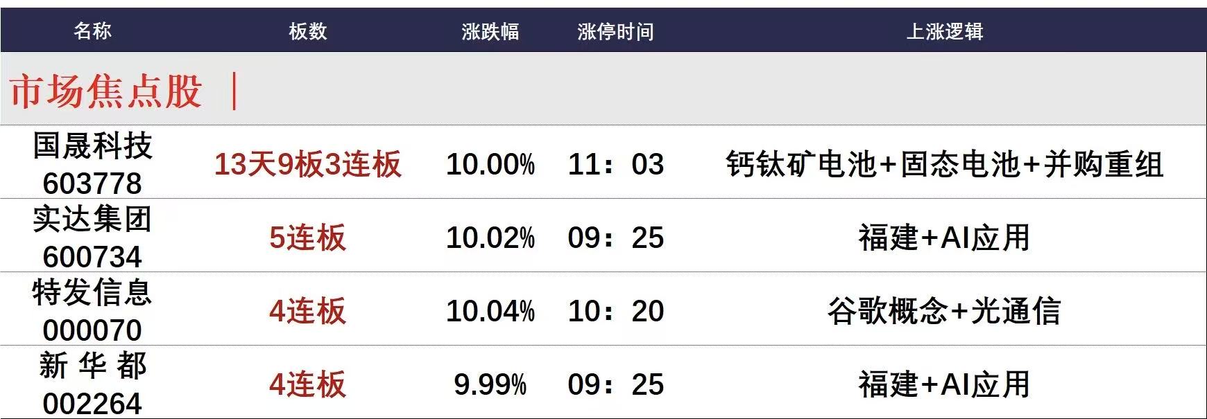 今日午盘全市场共57股涨停,连板股总数20只,14股封板未遂,封板率为80%(不含ST股、退市股)。焦点股方面,并购重组的国晟科技走出13天9板,AI应用概念股实达集团5连板、新华都4连板,谷歌概念股特发信息4连板。