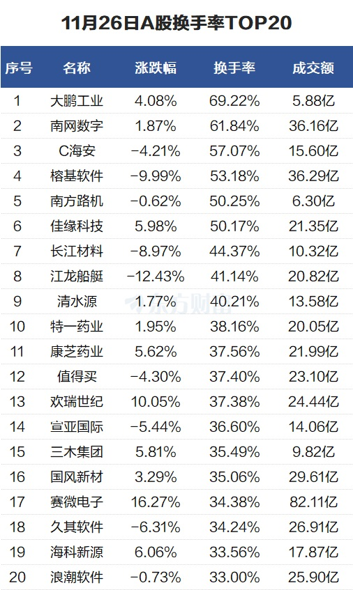 当天换手率最高的个股为大鹏工业,全天换手率69.22%。南网数字紧随其后,全天换手率61.84%。