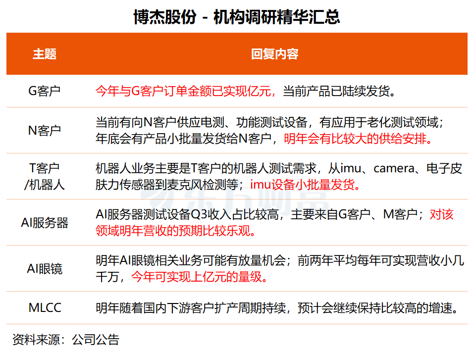 其中,博杰股份在接受中信建投、中南资本等9家机构调研时表示,公司第三季度营收中,AI服务器测试设备收入占比较高,公司对该领域明年营收的预期比较乐观。