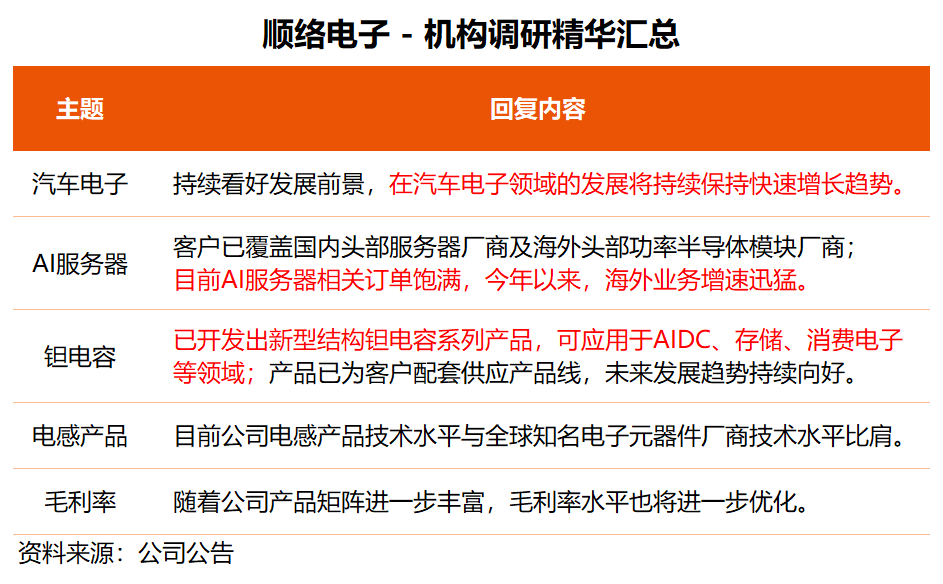 顺络电子在接受中泰证券、宝盈基金等13家机构调研时表示,公司为各类AI服务器类客户提供一站式元器件解决方案,客户已覆盖国内头部服务器厂商及海外头部功率半导体模块厂商;目前公司AI服务器相关的订单饱满,相关业务快速增长(今年来,海外业务增速迅猛)。