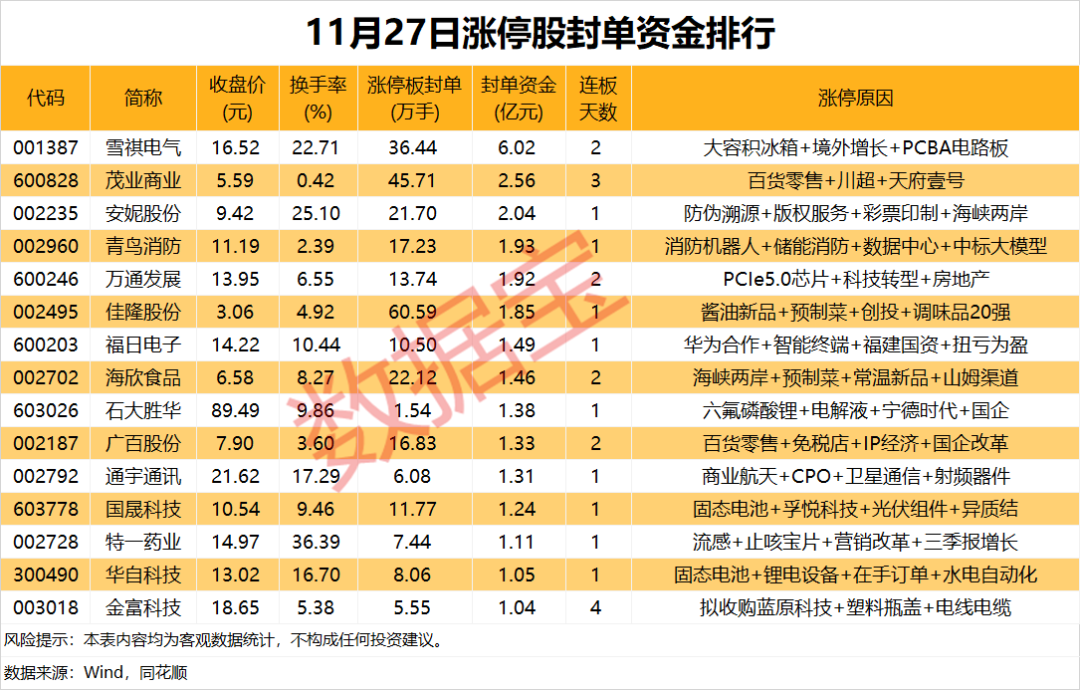 雪祺电气涨停,收盘共36.44万手封单。公司以“大容积冰箱+商用冷链”为主轴,正加速向产业上游及全球市场延伸,形成垂直一体化、国际化的新格局。龙虎榜数据显示,11月26日至27日期间,上榜营业部席位合计成交2.4亿元,合计净买入789.64万元。