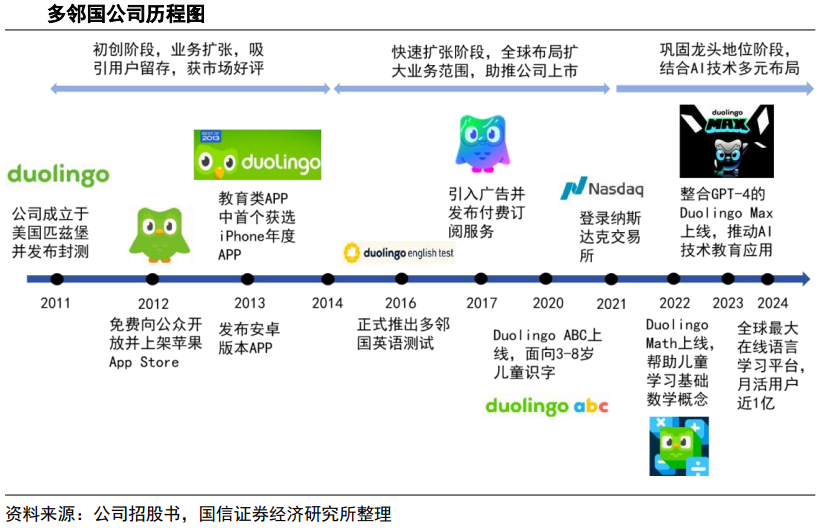 国信证券研报显示,多邻国是由“验证码之父”Luis von Ahn及其博士生Severin Hacker于2011年联合创立的教育科技公司。2021年7月末,公司在美股上市,最新总市值为87.11亿美元(约617亿元人民币)。